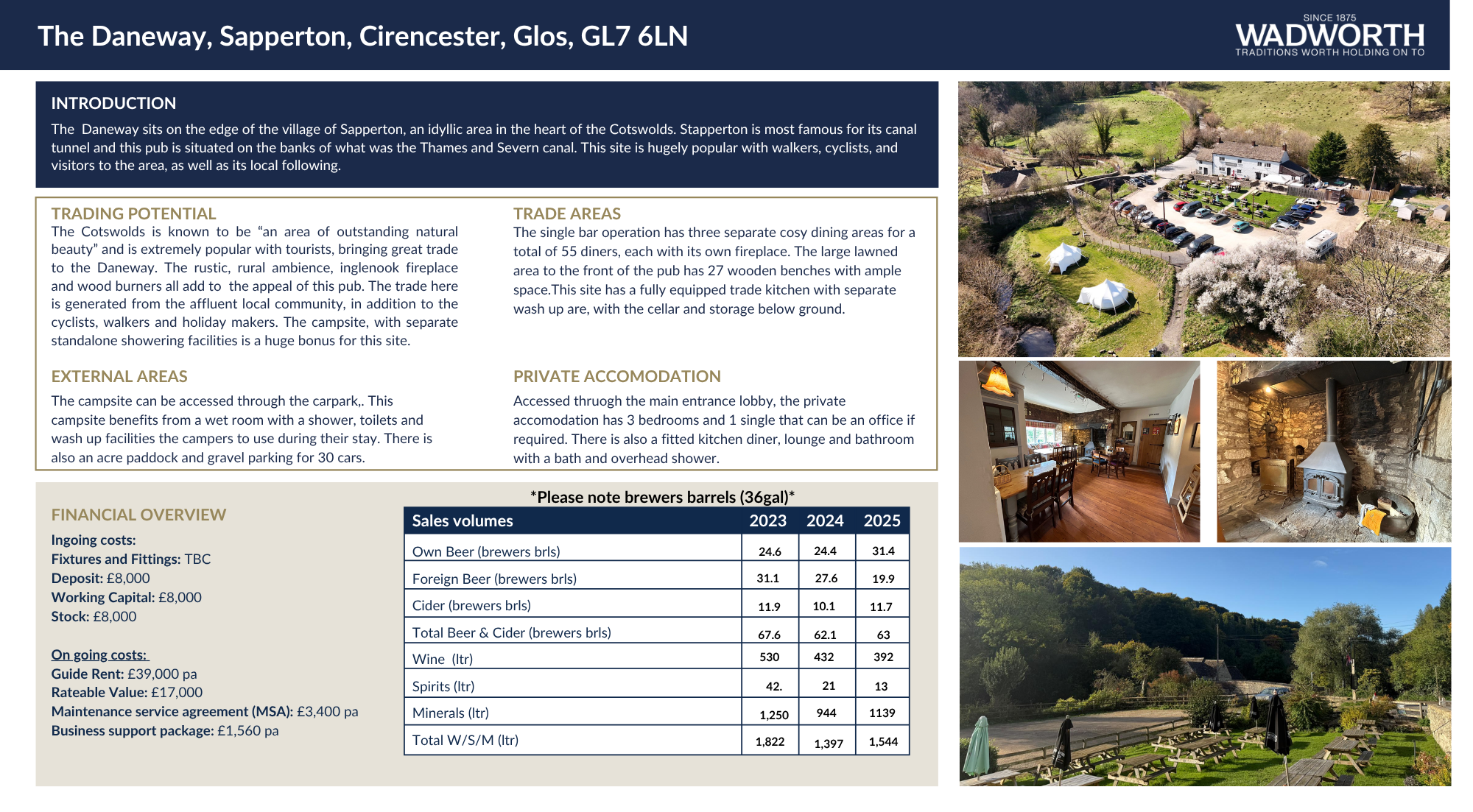 The Cotswolds is known to be “an area of outstanding natural beauty” and is extremely popular with tourists, bringing great trade to the Daneway. This site is trading well, split of 60 / 40 in favour of food. The rustic, rural ambience, inglenook fireplace and wood burners all add to the appeal of this pub. The trade here is generated from the affluent local community, in addition to the cyclists, walkers and holiday makers.